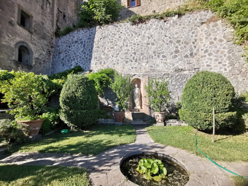 This first nucleus, defined by 1544, develops along Via della Piaggia, crossing it with hanging rooms, where the original entrance is located, from which rises the four-flight staircase, the beautiful staircase ascent mentioned by Giorgio Vasari in the “Life of Simone Mosca,” which leads to the hanging terrace, from where one accesses the Great Hall, already completed in 1542, destined for council sessions presided over by the governor of Bolsena: the representative function of the room is emphasized by the presence of the owner’s name inscribed on the architraves of doors and windows.