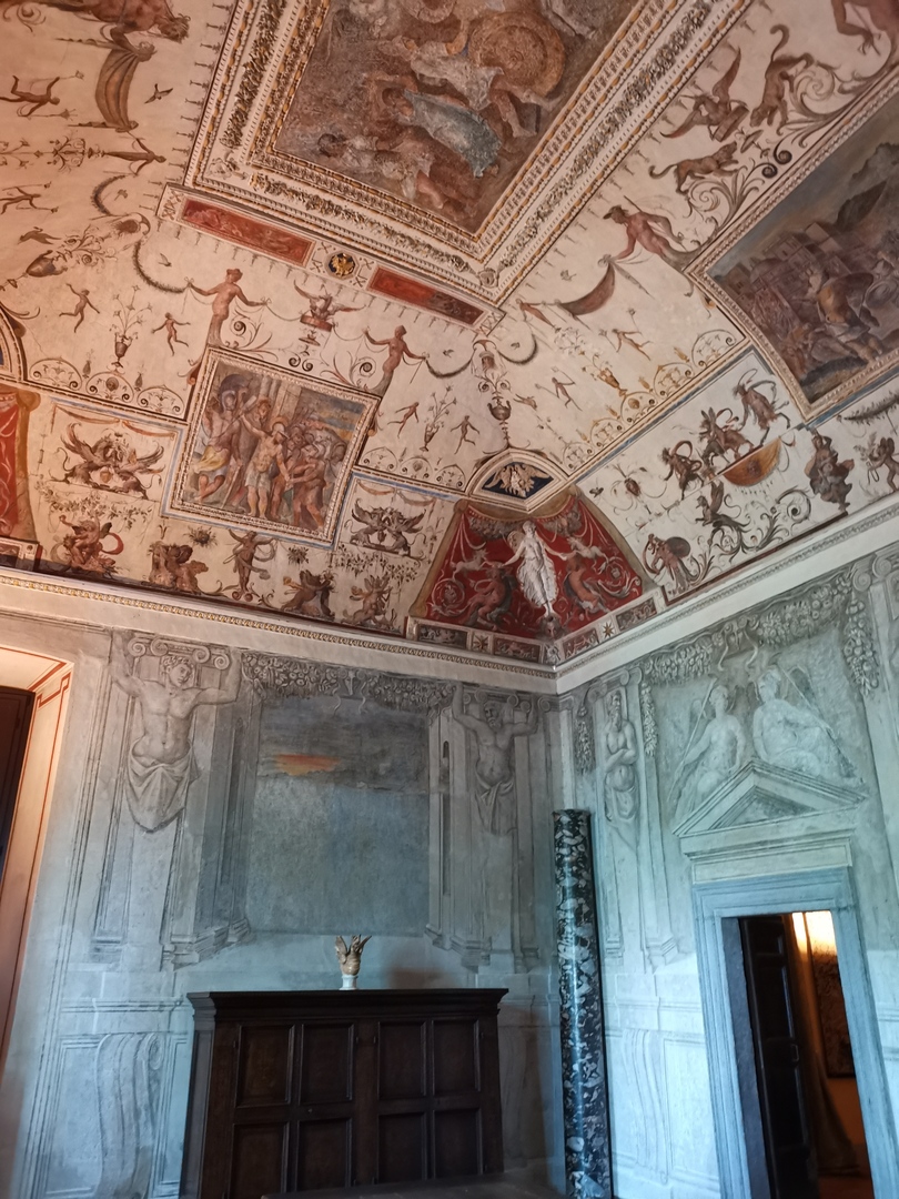 In the small hall, located on the second floor of the palace building called “the Torrazzo,” episodes from the Stories of Romulus are illustrated and chosen with particular reference to the history of Bolsena, in homage to the tradition according to which in the struggles against the Sabines, Romulus would have been helped by the Bolsena native Galerito Lucumene. On the walls appear grotesque motifs stylistically comparable to those of the Hall of Alexander the Great. These latter decorations present stylistic similarities with the Roman interventions of Luzio Luzi for the “Cagliostra” of Castel Sant’Angelo and for the frieze of the Hall of the Eagles in the Palazzo dei Conservatori, and therefore their execution is assigned to the hand of the Roman master in collaboration with Prospero Fontana.