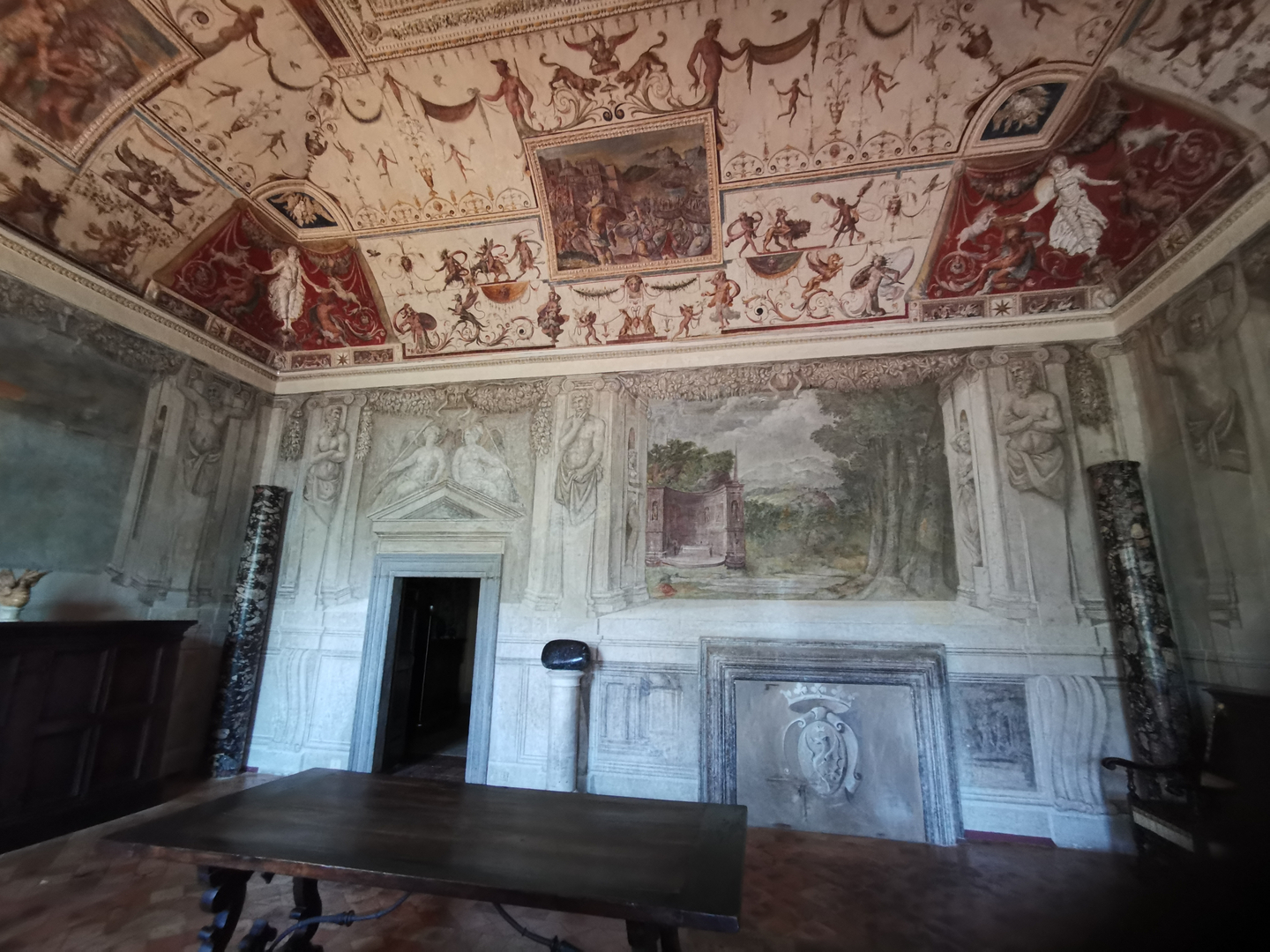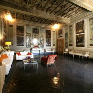The execution of the frescoes in the halls of the first and second floors dates between 1559 and 1562; they are attributable to the hand and workshop of Prospero Fontana and inspired by the great cycles of Roman palaces including that of Castel Sant’Angelo where, between 1543 and 1545, Crispo himself, appointed castellan, had overseen the works, and by masters such as Pellegrino Tibaldi, Raffaellino del Colle, and Perin del Vaga.